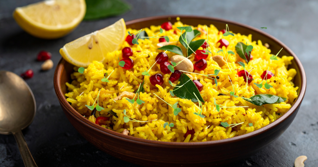 Lemon rice becomes even healthier when topped with green mustard or pink radish microgreens. Their fresh taste balances the tangy citrus flavour perfectly.