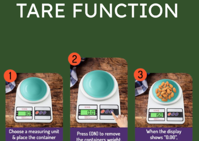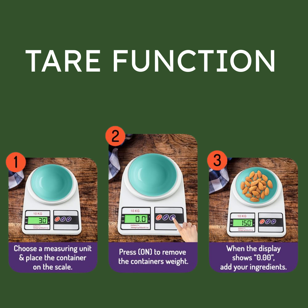 Easily calculate the net weight of ingredients by subtracting empty bowl or the container weight. Touch the TARE button to reset the scale back to zero and weigh ingredients by adding it in to the same container.
