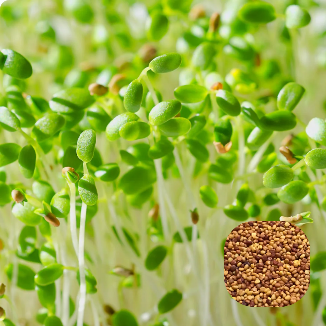 Clover seeds grow into delicate microgreens with tender stems and small leafy shoots, offering a mild fresh flavor with subtle sweetness. These microgreens are rich in vitamins, minerals, and natural enzymes and are commonly used in salads, sandwiches, wraps, and smoothies.