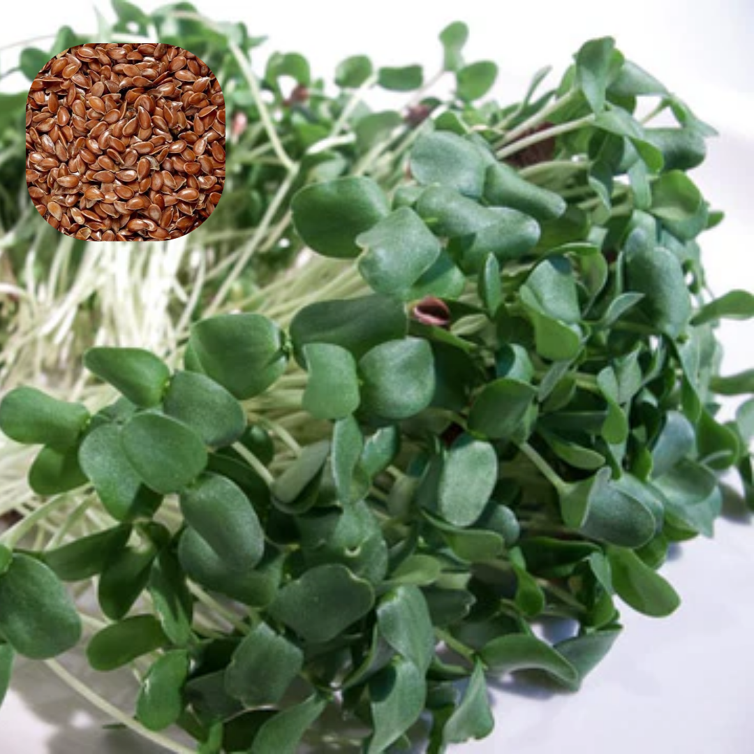 Flax seeds grow into tender microgreens with soft stems and delicate leaves, offering a mild nutty flavor and smooth texture. These microgreens are rich in plant-based omega fatty acids, fiber, and antioxidants, making them a nutritious addition to everyday meals.