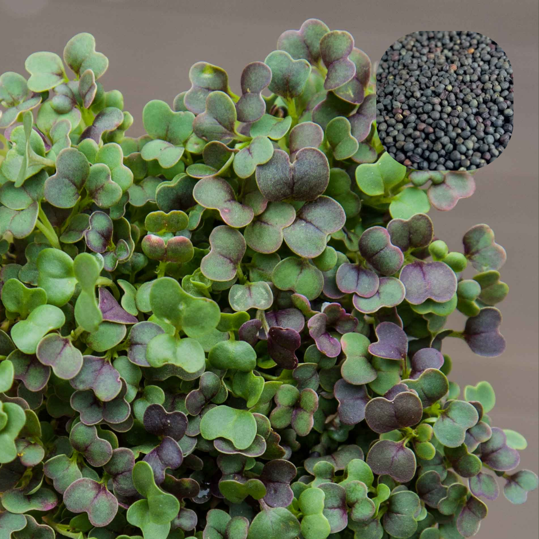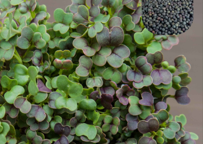 Komatsuna microgreens are the young shoots of the Japanese mustard spinach plant harvested early when their nutrients and antioxidants are highly concentrated. These microgreens develop delicate stems and leafy greens with a mild mustard-like flavor that is softer than traditional mustard greens.