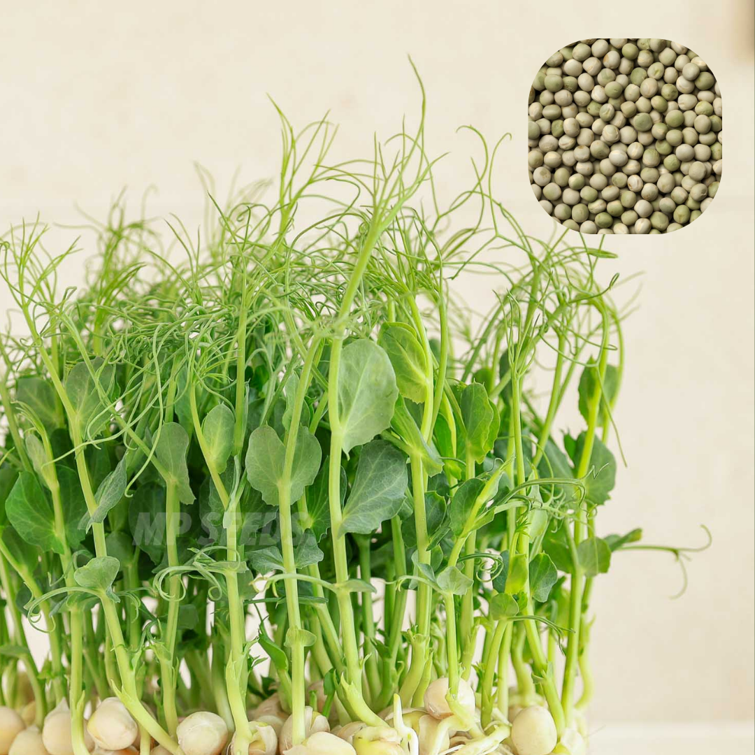 Pea seeds grow into tender pea shoots with curly tendrils and a naturally sweet flavor similar to fresh green peas. These crunchy microgreens add freshness and nutrition to meals such as vegetable pulao, poha, sandwiches, chaat, and stir-fried vegetables.