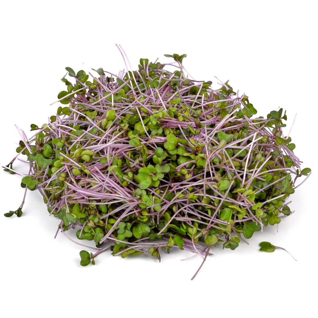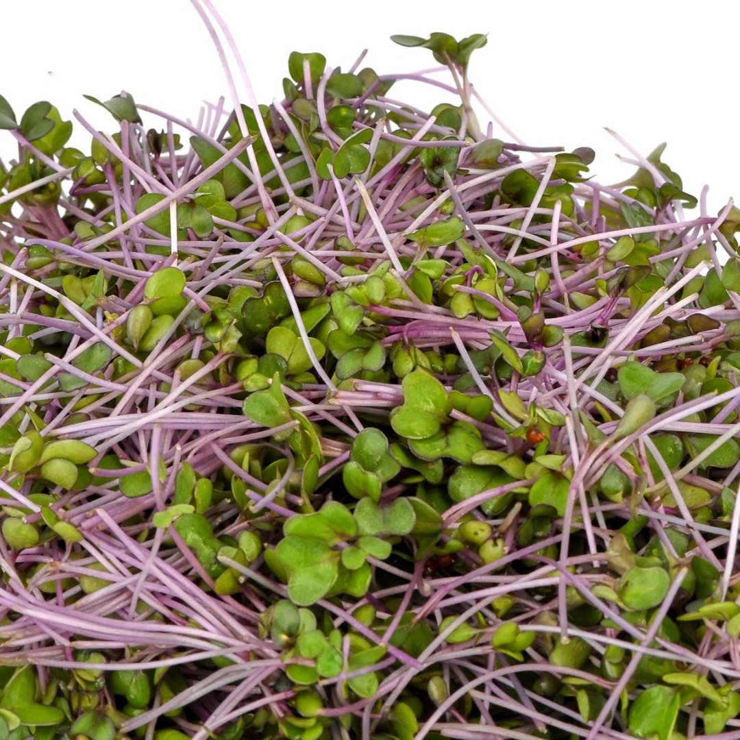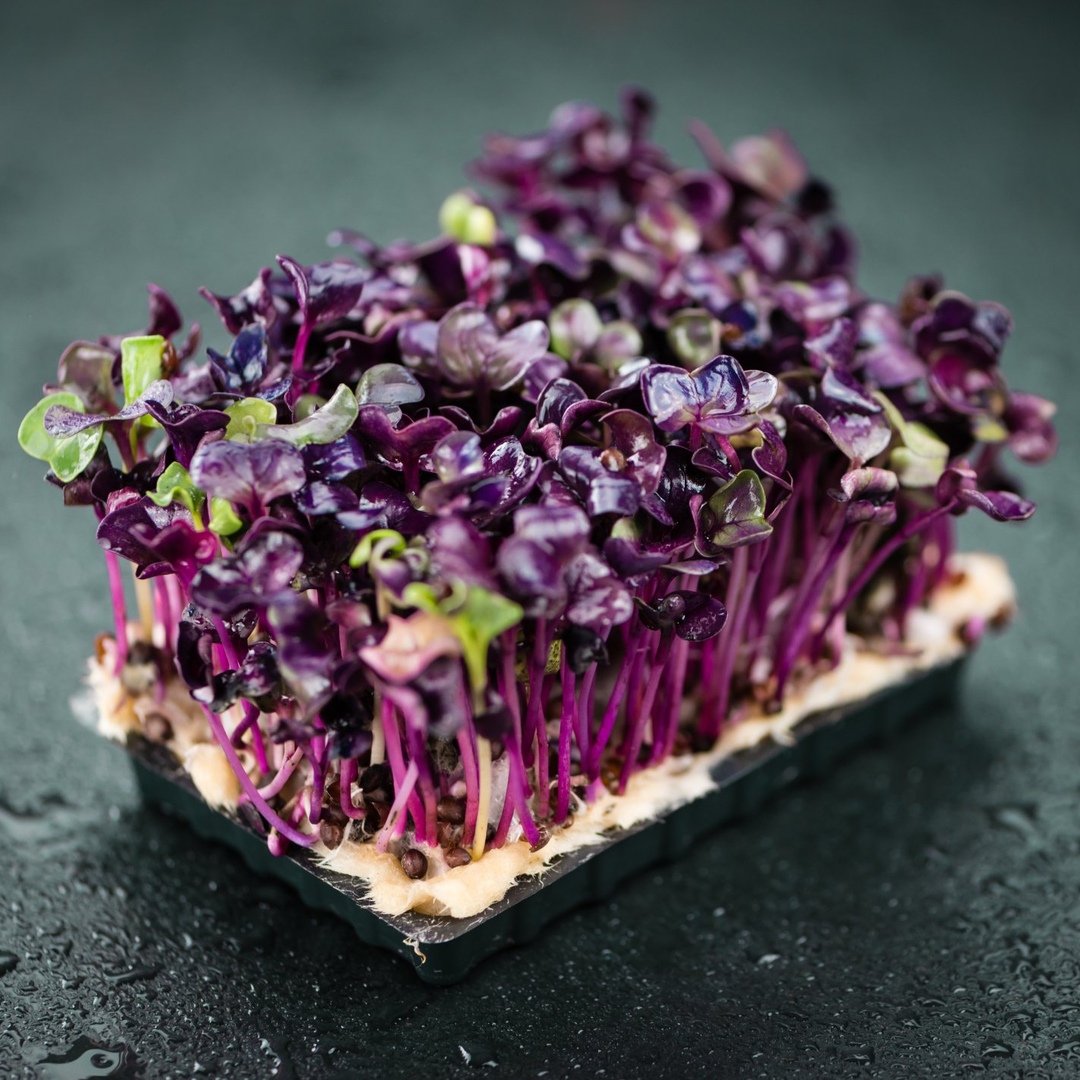 Mildly sweet with a subtle earthy flavor, Red Cabbage microgreens add vibrant color and freshness to dishes like salads, tacos, sandwiches, grain bowls, and wraps.