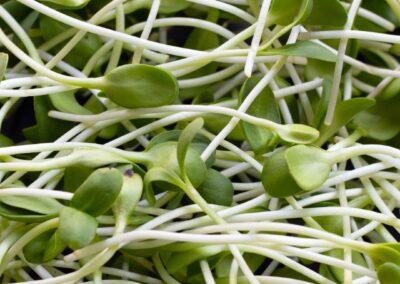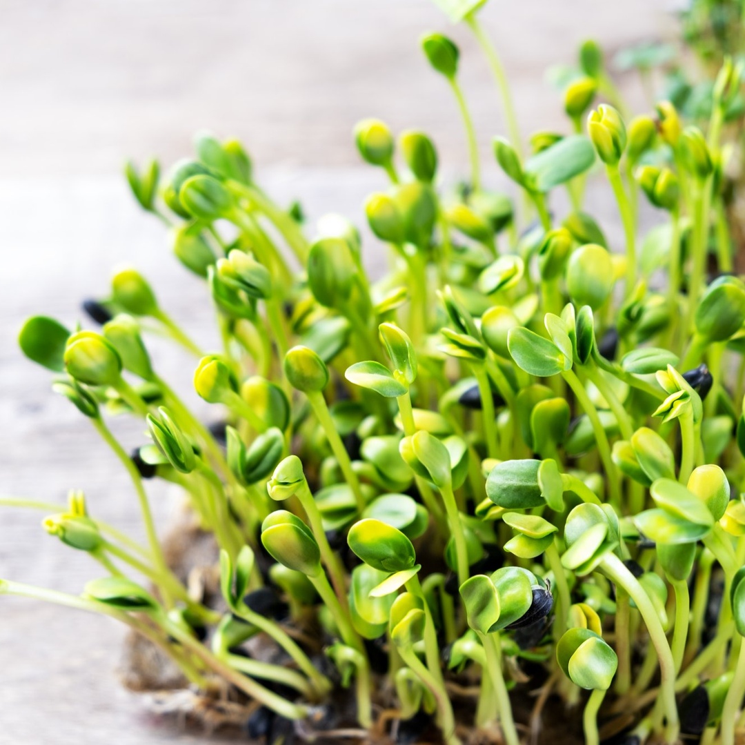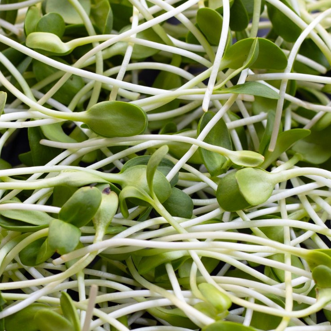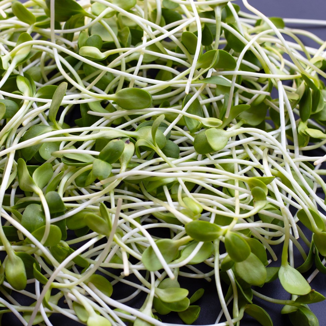 Sunflower microgreens are harvested when their thick stems and crunchy leaves are at peak nutrition. Known for their nutty flavor and satisfying texture, they are one of the most filling microgreens.