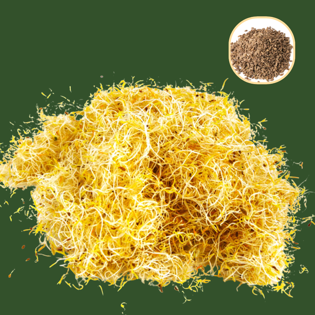 Yellow carrot seeds grow into delicate microgreens with soft feathery leaves and a mild carrot flavor. These microgreens add freshness and color to dishes like salads, sandwiches, vegetable bowls, and healthy wraps.